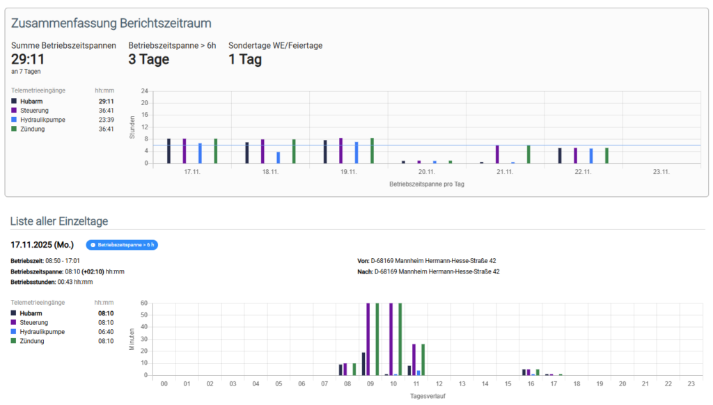 Werden mehrere Fahrzeuge ausgewertet, startet der Bericht mit einer kompakten Übersichtstabelle. Sie fasst alle Betriebszeitspannen und definierten Markierungen zusammen und schafft so einen klaren Überblick über den gesamten Berichtszeitraum.