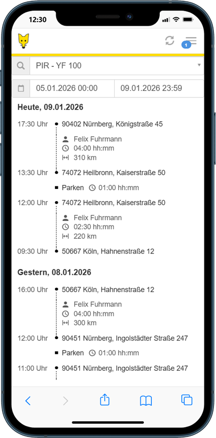 Ab sofort steht im Mobilportal der neue Menüpunkt „Fahrten“ zur Verfügung. Mit diesem Modul können vergangene Fahrten von Fahrzeugen schnell und übersichtlich recherchiert werden. Die Ansicht umfasst wichtige Fahrtdetails wie Start- und Endzeitpunkte, Orte, Fahrtdauer, zurückgelegte Distanz sowie den jeweils angemeldeten Fahrer.