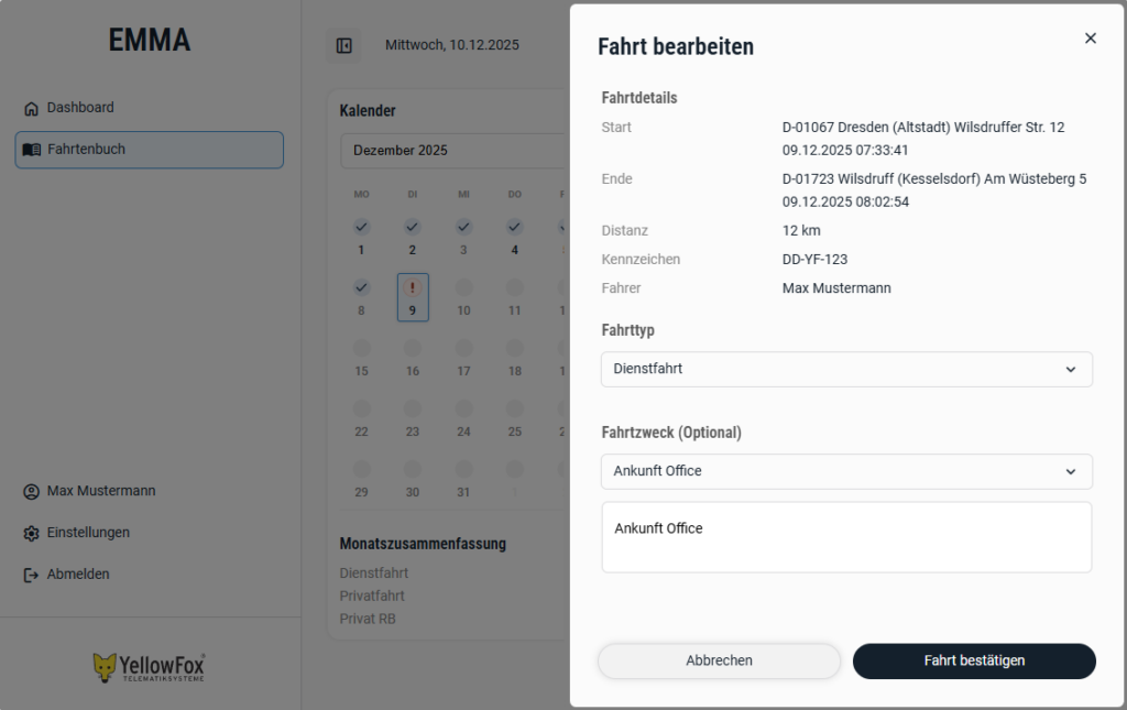 Bei der späteren Erstellung des endgültigen finanzamtskonformen Fahrtenbuchs im YellowFox Ortungsportal werden diese vorab gepflegten Fahrten automatisch übernommen.