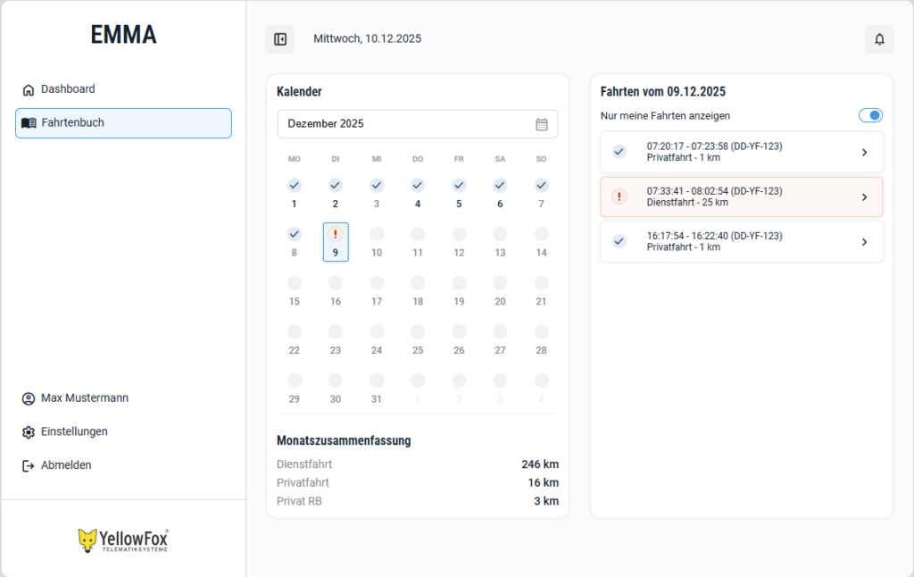 Um die Erstellung von Fahrtenbüchern für Poolfahrzeuge einfacher, schneller und datenschutzkonform zu machen, kann Ihr Fahrpersonal seine Fahrtzwecke ab sofort direkt in ihrer eigenen persönlichen EMMA-App pflegen. Dort sehen und verwalten die Fahrer nur die eigenen Fahrten. Über die EMMA-App können Fahrttyp (Privat- / Dienstfahrt) und Fahrtzweck im Fahrtenbuch gepflegt werden.