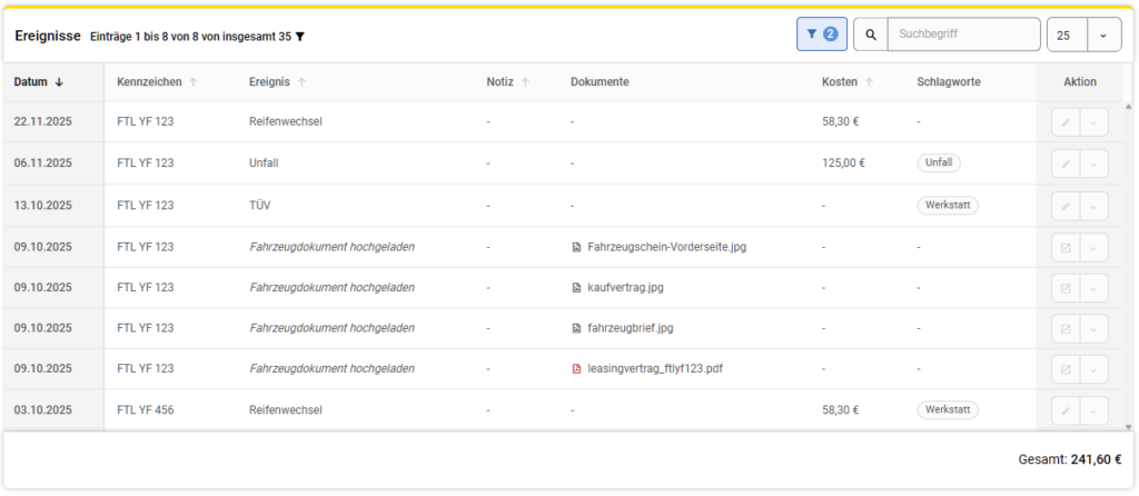 Durch die angefallenen Werkstatttermine befüllt sich automatisch auch die neue Fahrzeugakte. Hier können Sie eine Historie zu Ihrer Flotte führen. Neben den Einträgen zu Werkstattbesuchen können Sie auch völlig frei weitere Ereignisse erfassen, wie beispielsweise das Kaufdatum oder Unfälle. Schreiben Sie Notizen oder hängen Sie Dateien an, um Ihre Fahrzeuge lückenlos zu dokumentieren. Mit Hilfe von Schlagworten ist eine spätere Recherche kinderleicht. Die Fahrzeugakte wird bei uns 8 Jahre archiviert – so kommen Sie auch der gesetzlichen Dokumentationsfrist nach.